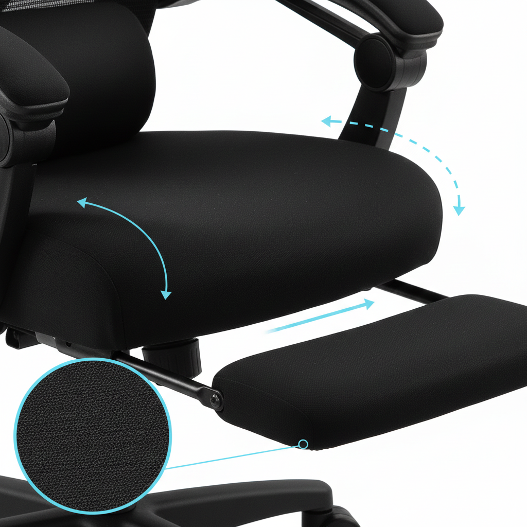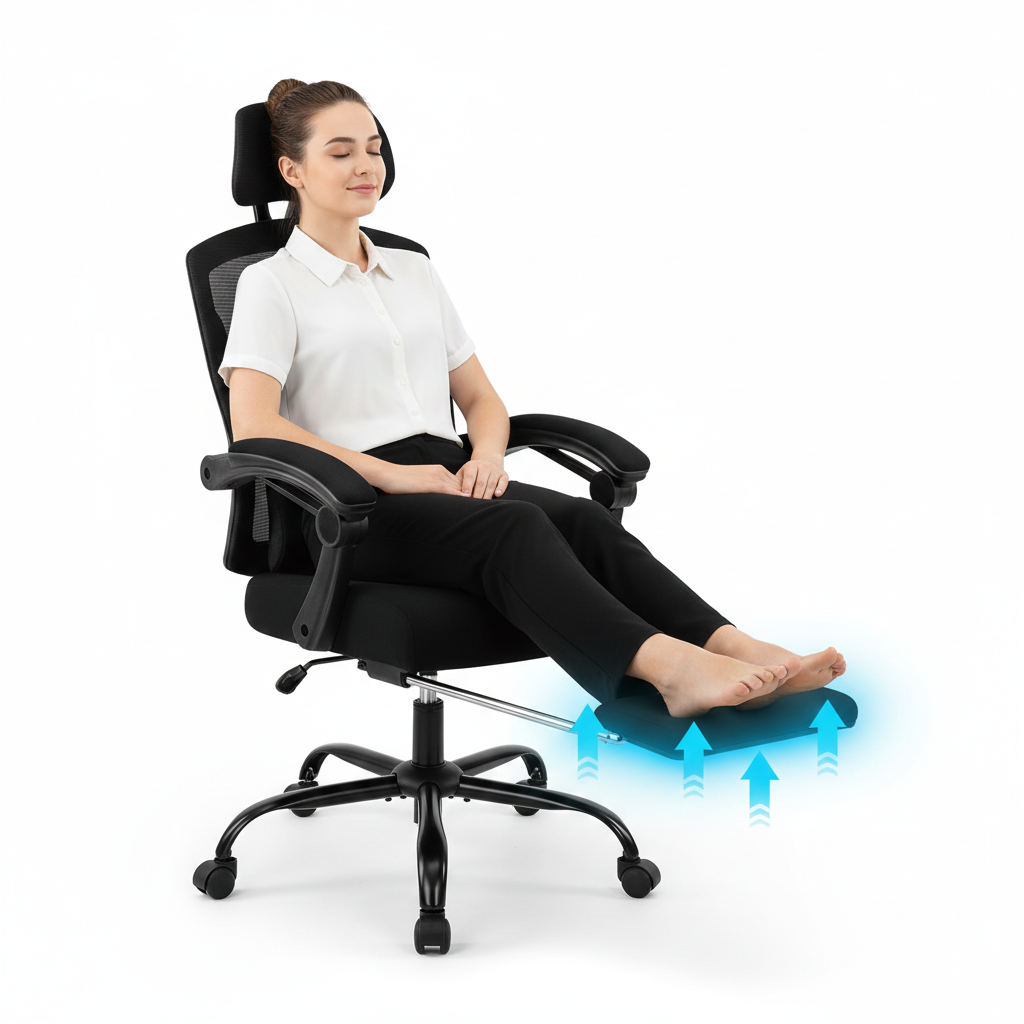 Étirez vos jambes en un geste grâce au repose-pieds intégré. La circulation est améliorée pour réduire la fatigue en fin de journée. Idéal pour les pauses, les appels ou les sessions de travail prolongées. Le mécanisme est fluide, stable et conçu pour durer. Un confort supplémentaire qui fait toute la différence au quotidien.