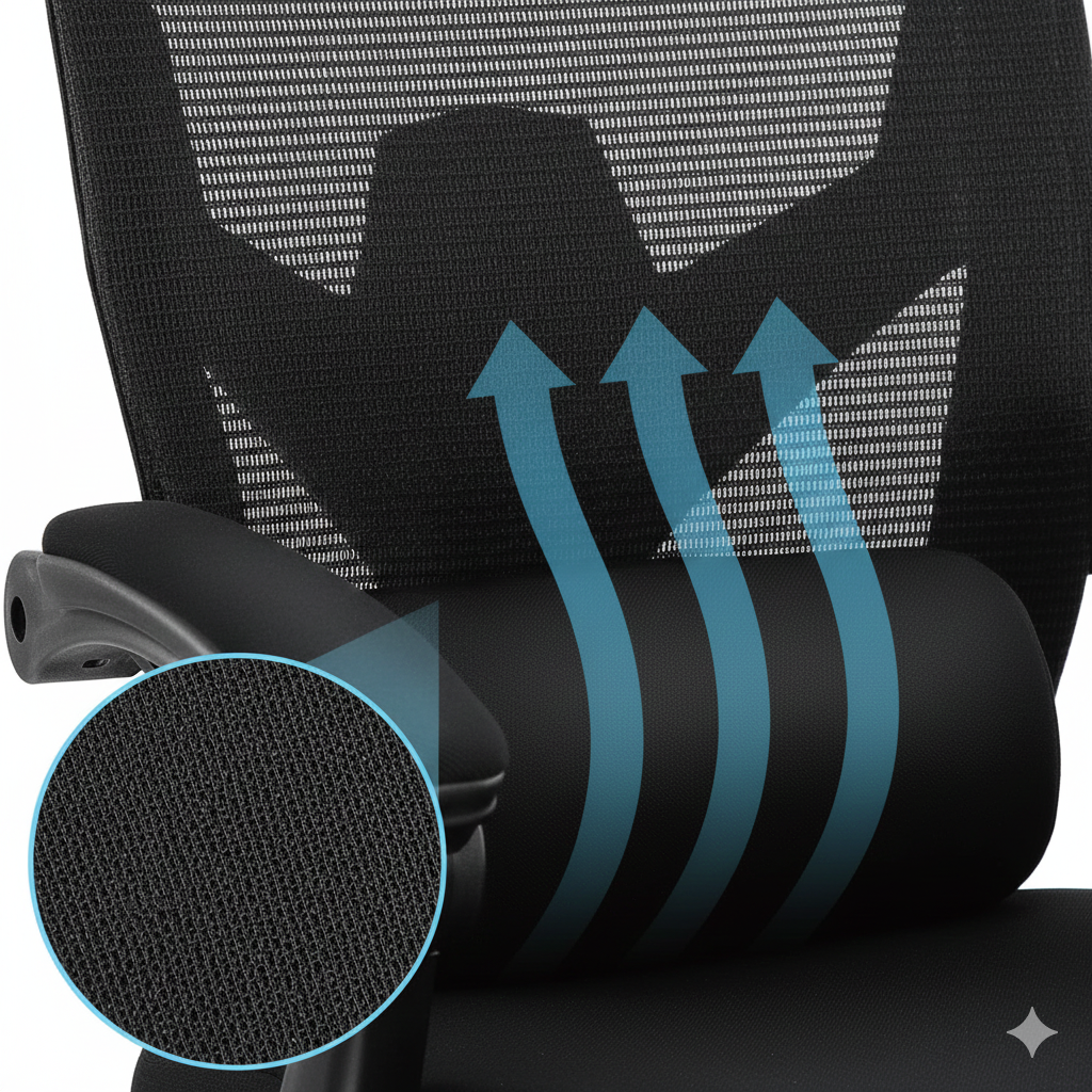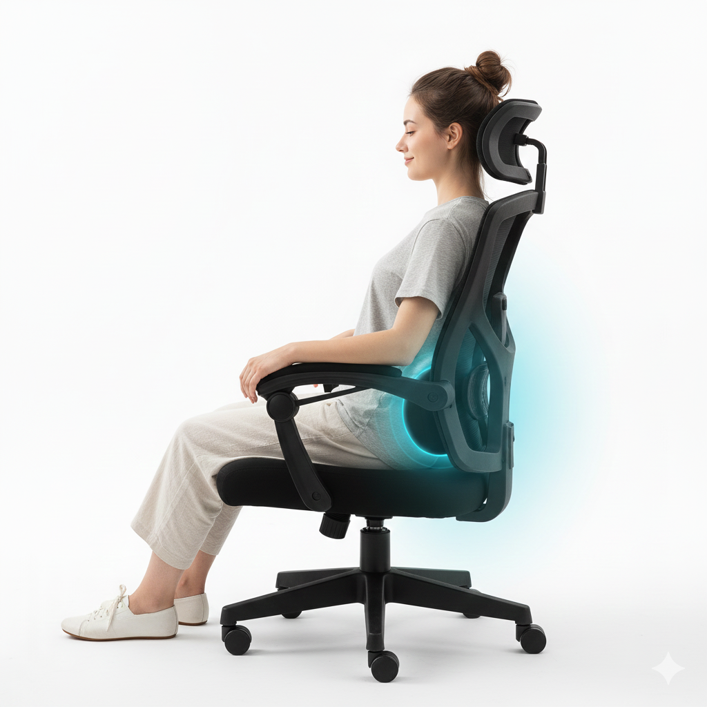Son dossier en maille respirante épouse naturellement la forme du dos et intègre un soutien lombaire ajustable, permettant de réduire la pression et de maintenir une posture saine.