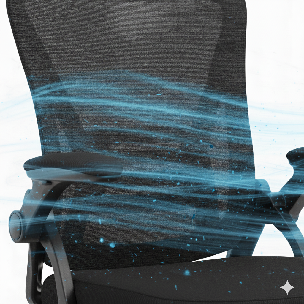 Notre chaise est conçue avec un dossier et une assise en mesh de qualité supérieure, une innovation pensée pour votre bien-être. Ce matériau unique permet à l'air de circuler librement, créant une ventilation constante et naturelle.