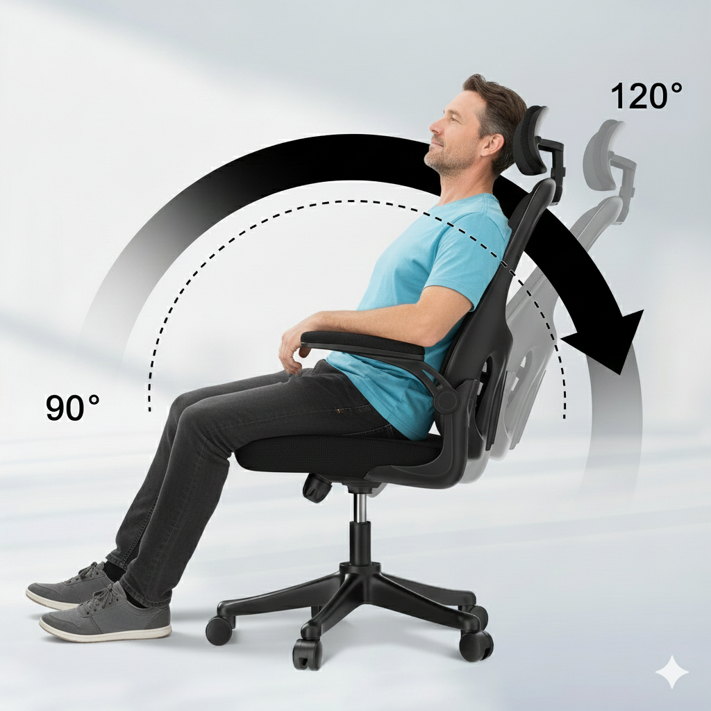 Les accoudoirs rabattables à 90° permettent de libérer facilement de l’espace sous le bureau, et le mécanisme de bascule 90°–105° offre une position plus détendue lorsque vous en avez besoin.