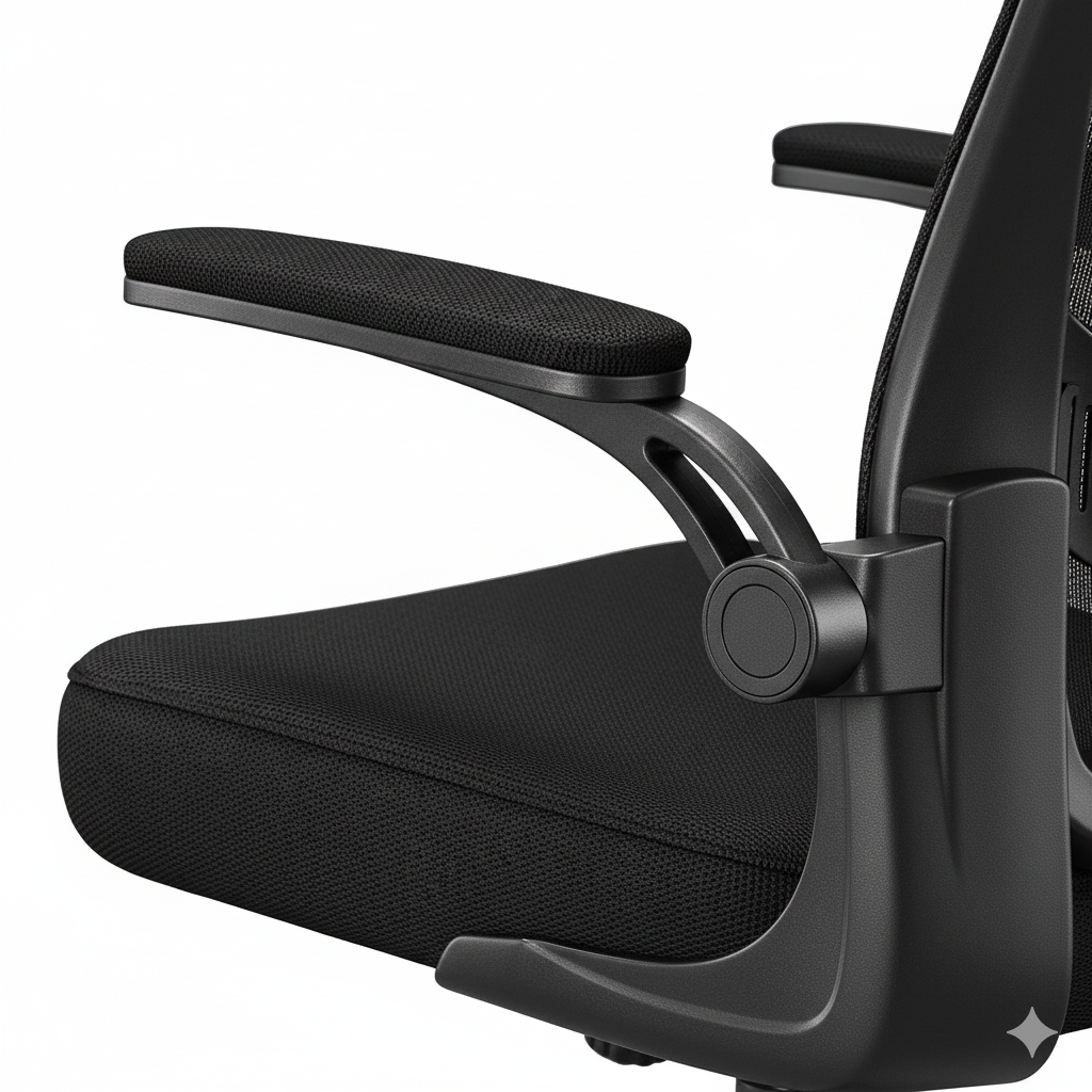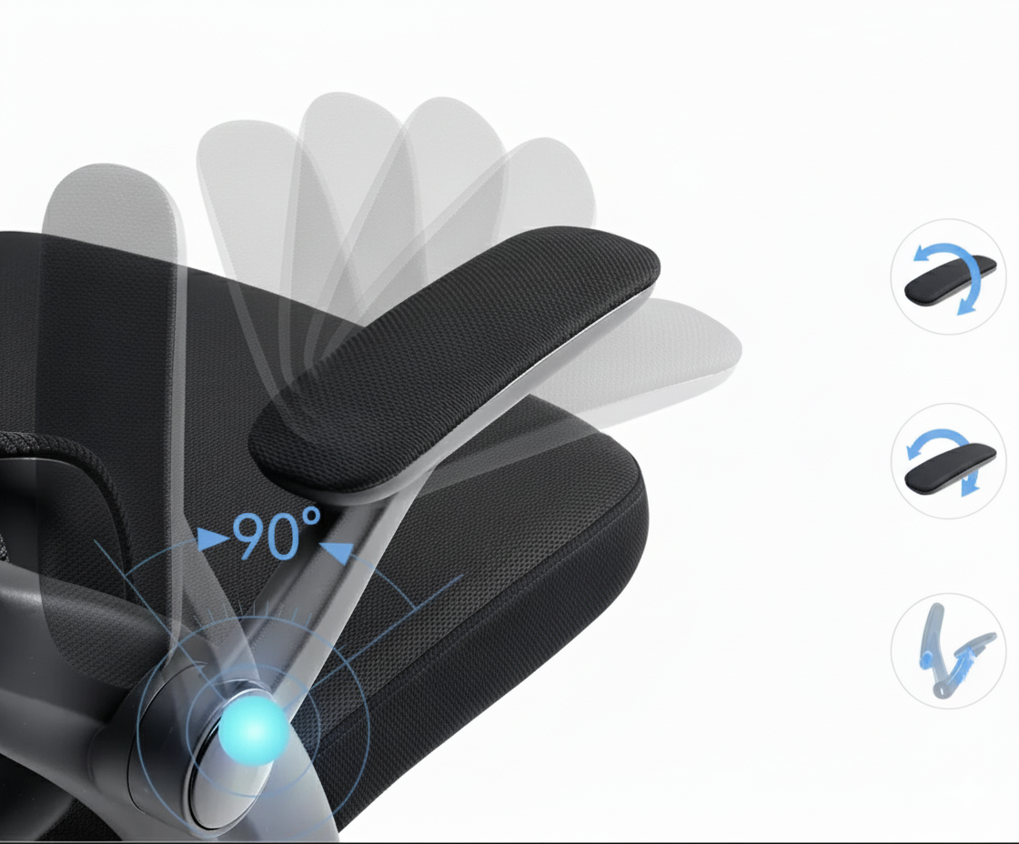 Nos accoudoirs ont été conçus pour s'adapter à votre vie, pas l'inverse. Rabattables à 90°, ils permettent de glisser votre chaise complètement sous n'importe quel bureau. Un geste simple pour libérer instantanément de l'espace dans votre pièce.