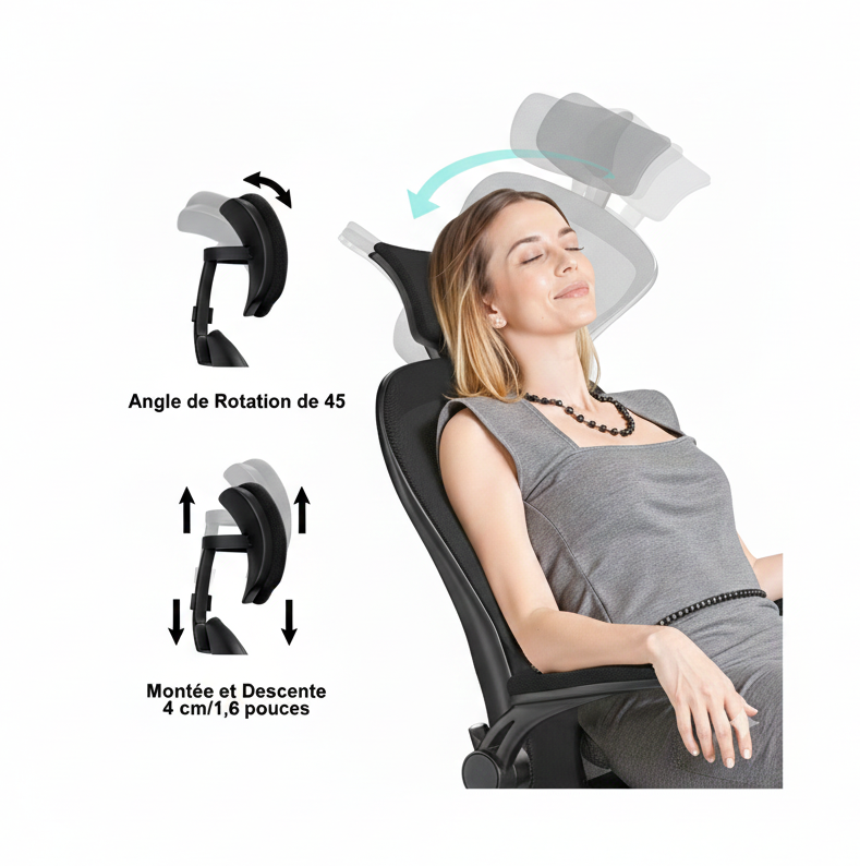 L'appui-tête est conçu pour un confort sur mesure, essentiel pour les longues journées.
